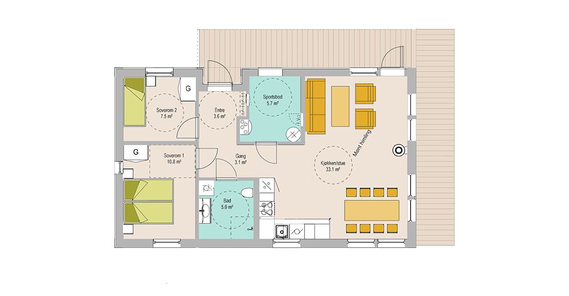 Denne eneboligen på ett plan har en moderne og praktisk planløsning, med store vindusflater i gavlveggen som gir rikelig med naturlig lys og en åpen følelse. Boligen består av to soverom, et romslig bad og en stor sportsbod for ekstra lagring. En romslig entre med gode garderobemuligheter gir et funksjonelt inngangsparti, og mellomgangen gir god flyt mellom rommene. Kjøkken og stue er kombinert i en åpen og lys løsning, som skaper et sosialt og innbydende oppholdsrom. De store vindusflatene i gavlveggen gir utsikt mot fine omgivelser og gir ekstra lys til oppholdsrommet. Fra stuen er det direkte tilgang til uteområdet gjennom en egen terrassedør.