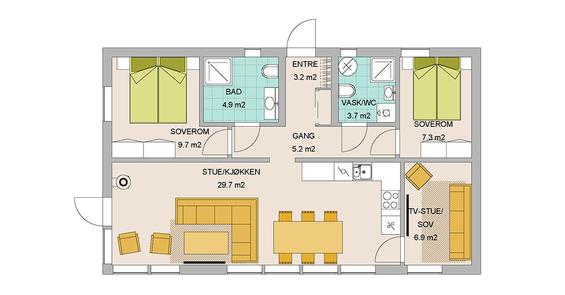Du kommer inn i en romslig entré. Herfra via gangen tar du deg videre enten til soverommene, badet eller vaskerommet som også har plass til en ekstra dusj og wc. Går du gjennom gangen så kommer du til stue og kjøkkenet som gir et flott utsyn til naturen. De store vindusflatene gjør opplevelsen av hytta større ved å dra naturen inn. Innenfor kjøkkenet er det egen tv stue som kan benyttes avskjermet, evt. kan dette også omgjøres til et soverom til. I tillegg har du mulighet for utvendig bod på ene gavlveggen.