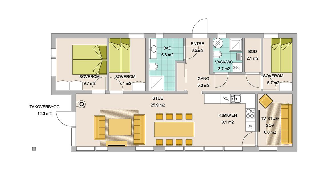 Du kommer inn i en romslig entré. Herfra via gangen tar du deg videre til to av soverommene, badet eller vaskerommet som også har plass til en ekstra dusj og wc. TV-stuen gir det også muligheter for ekstra soveplass. Fra den store stuen/kjøkkenet kan du nyte utsyn til naturen gjennom de store vindusflatene. Egen adkomst til et romslig soverom 3. Mulighet for utvendig bod på ene gavlen.