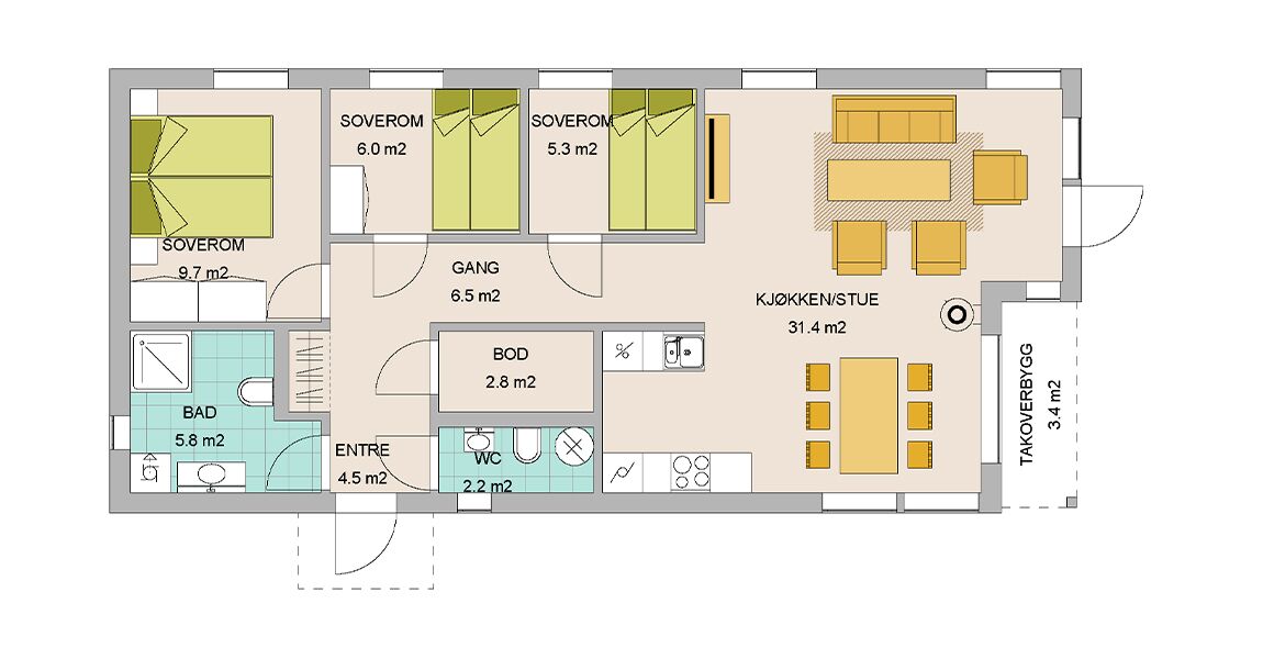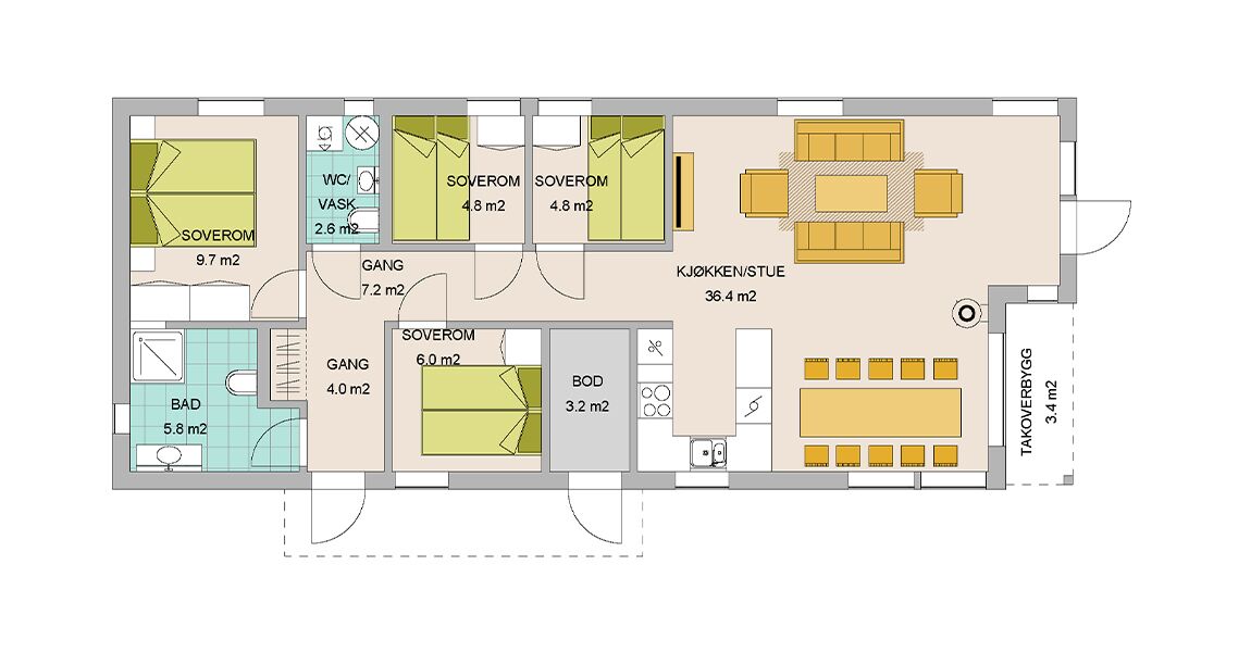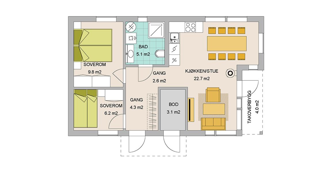 En arealeffektiv sportshytte som passer de fleste tomter siden bredde bare er rett i overkanten av 6,3m. Livskvalitet kan like godt skapes i mere kompakte løsninger som i de større hyttene som krever større eiendom og høyere budsjett. Nyt dagene i denne praktiske hytte, dog ikke minst ute i den frie natur.
