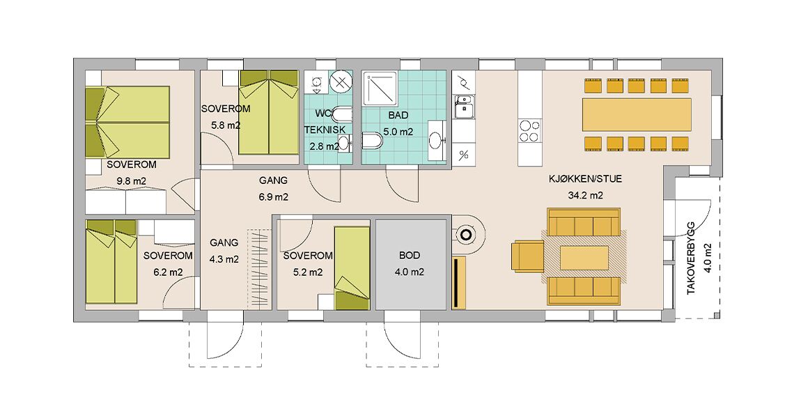 Sportshytte med smarte løsninger som utnytter arealet godt og har overbygd terrassedel. Består av tre romslige soverom, ett bad, vaskerom/WC, innvendig bod. Smart stue/kjøkken løsning med åpen himling som gir lun romfølelse. Stue kjøkken har to soner og fra begge kan du nyte utsikten gjennom de store vindusflatene eller du kan kose deg med synet av flammene fra peisovnen.