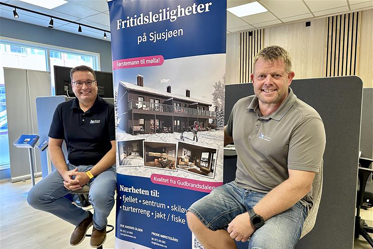 "Her får du det enkle fjellivet midt i sentrum på Sjusjøen", sier Bjørn Morten Grothe og Ove Anders Olsen i Blånehytter. Nå skal de selge og bygges seks nye fjell-leiligheter midt i sentrum på Sjusjøen (Foto: Ragnhild Fladsrud, Ordfryd AS)