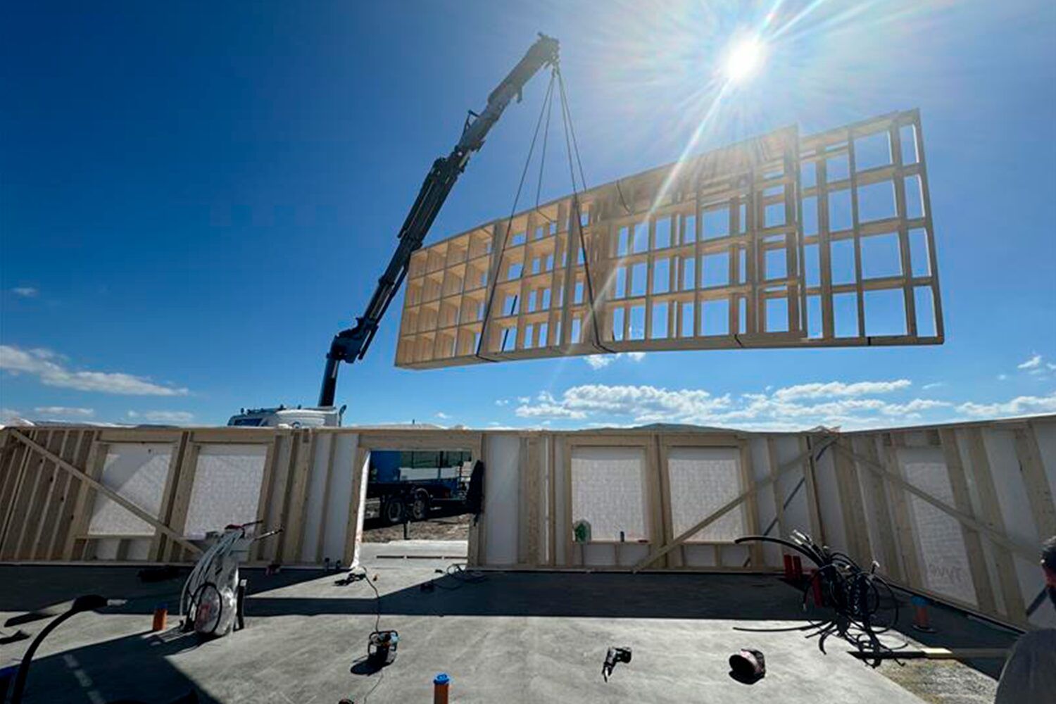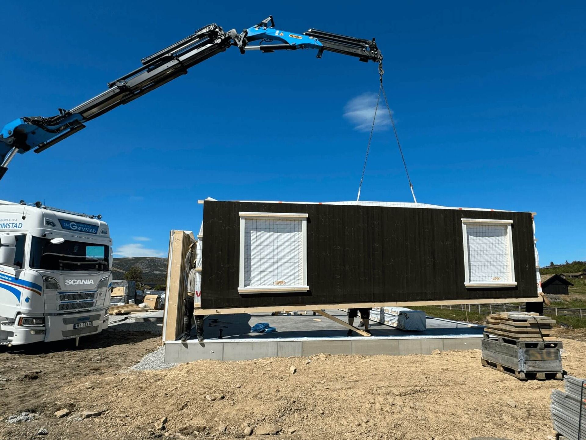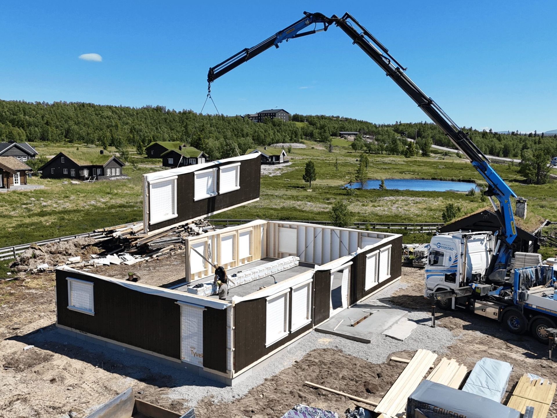 Blåne bygger i tre og produserer veggelementer (yttervegg og innervegger) på egen fabrikk på Fåvang i Gudbrandsdalen. Isolering skjer på byggeplass med blåseisolering i vegger og himling, noe som er rasjonelt og bærekraftig. Byggeprosessen utover dette er snekkerarbeid etter tradisjonelle byggdetaljer og teknisk forskrift.