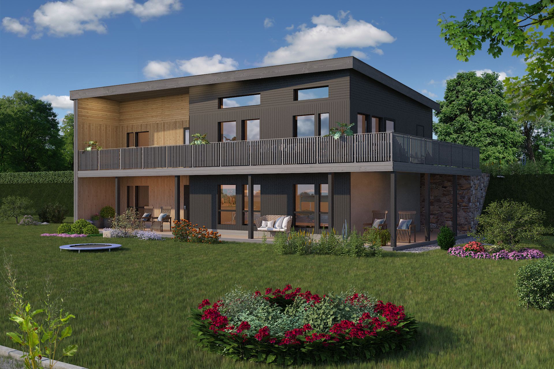 Ved inngangspartiet har du direkte tilgang til en praktisk sportsbod utendørs. Når du går inn i hovedetasjen, blir du møtt av et romslig inngangsparti med god plass til garderoben din. Derfra leder det deg inn i en stor og luftig hall som gir tilgang til et bad, to soverom, en trapp som fører ned til underetasjen, et kjøkken og en TV-stue med skrå himling. Skråtaket og vinduene som strekker seg opp mot himlingen inviterer rikelig med naturlig lys inn i rommet, og skaper en lys og livlig atmosfære. Både TV-stuen og hallen har utgang til en balkong, som gir deg muligheten til å nyte frisk luft og den vakre utsikten.