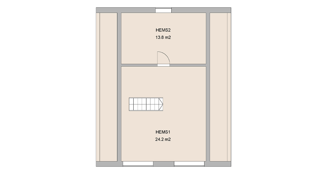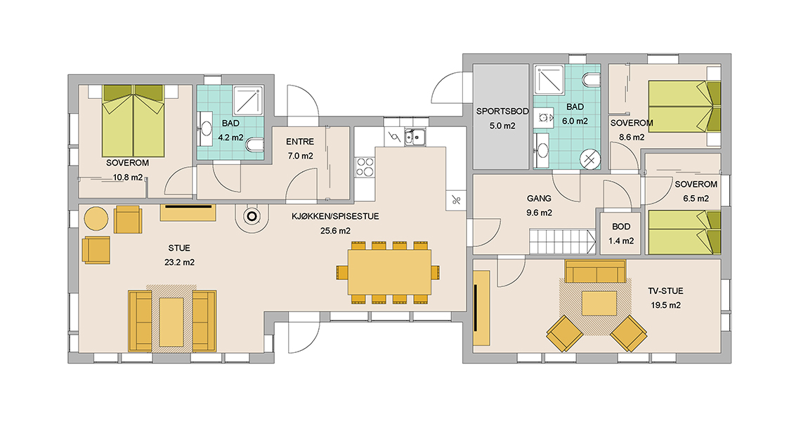 Består av tre romslige soverom, to bad, romslig gang og garderobemuligheter. Hemsen er meget romslig og er fordelt på to rom, gulvareal på hele 38m2. Stuedelen har åpen himling som gir en god og trivelig romfølelse. Romslig kjøkken med spisestue og her kan du nyte et måltid og se rett i flammene på peisovnen. Med egen TV stue i tillegg byr denne hyttemodellen på gode soner som gjør den svært fleksibel om man er få som bruker hytta eller om man har med seg vennefamilien.