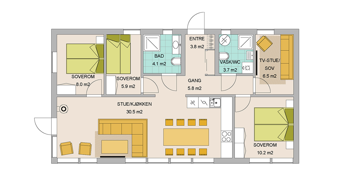 Du kommer inn i en romslig entré. Herfra via gangen tar du deg videre til to av soverommene, badet eller vaskerommet som også har plass til en ekstra dusj og wc. TV-stuen gir det også muligheter for ekstra soveplass. Fra den store stuen/kjøkkenet kan du nyte utsyn til naturen gjennom de store vindusflatene. Egen adkomst til et romslig soverom 3. Mulighet for utvendig bod på ene gavlen.