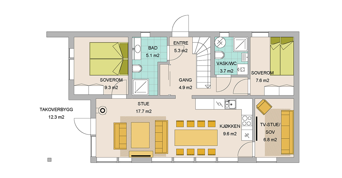Stor og god entré med tilgang til et stort bad. Herfra får du også tilgang til hemsen som gir ekstra muligheter og plass. I gangen kommer du videre til vaskerom som også har plass til en ekstra dusj og wc, eller til en innvendig bod. Stuen gir med sin mønt himling ekstra luft og romfølelse i rommet, herfra kan du gå ut til en overbygget uteplass, og være ute uansett vær. Fra stuen/kjøkkenet får du også tilgang til soverommene.